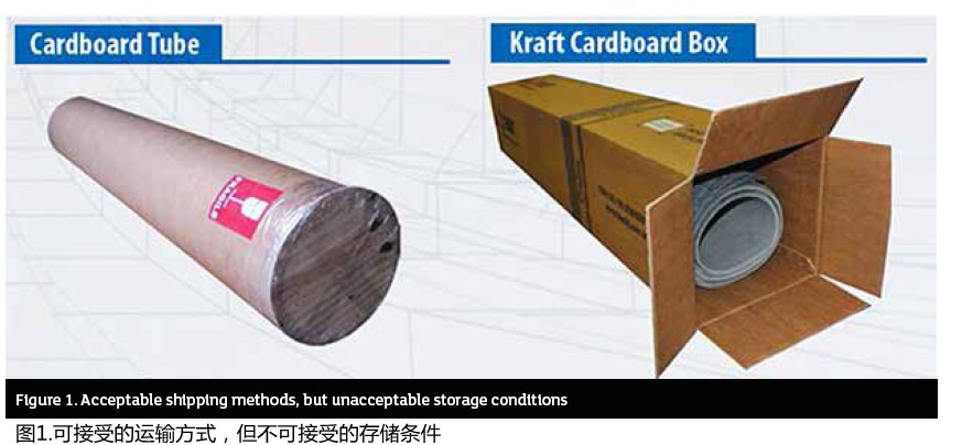 請注意,特別是對于彈性體粘合纖維片材,盡管盒子和紙管是經(jīng)批準的以卷材形式運輸片材的方法,但它們不應在任何情況下用作長(cháng)期存放(參見(jiàn)圖1)。