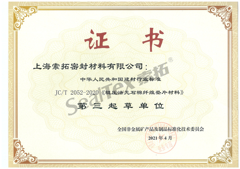 上海索拓密封材料有限公司(以下簡(jiǎn)稱(chēng)“我司”)參與起草了JC/T 2052-2020《輥壓法無(wú)石棉纖維墊片材料》標準