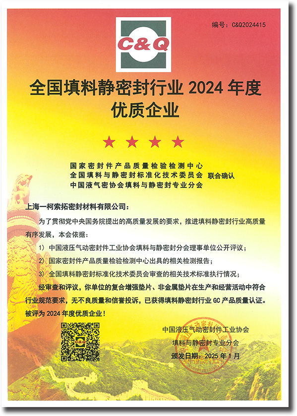 上海一柯索拓密封材料有限公司榮膺"全國填料靜密封行業(yè)2024年度優(yōu)質(zhì)企業(yè)"稱(chēng)號,以創(chuàng )新密封技術(shù)驅動(dòng)產(chǎn)業(yè)未來(lái)。